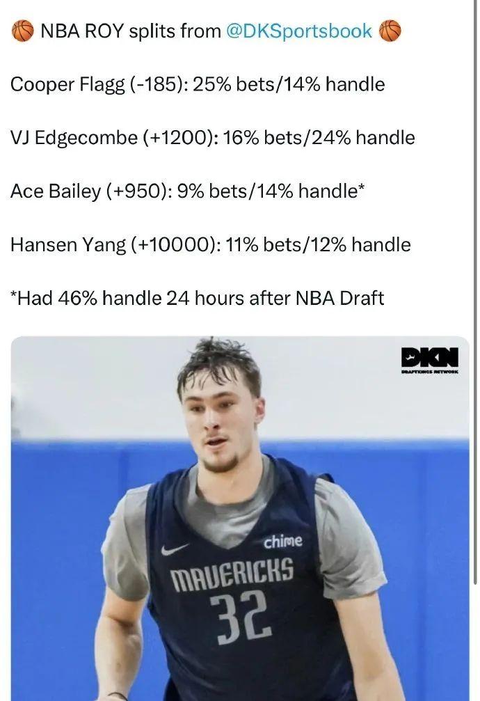 明年的最佳新秀,杨瀚森还是有+10000的赔率,意味着你买100块杨瀚森最佳新秀,你就不见了100块